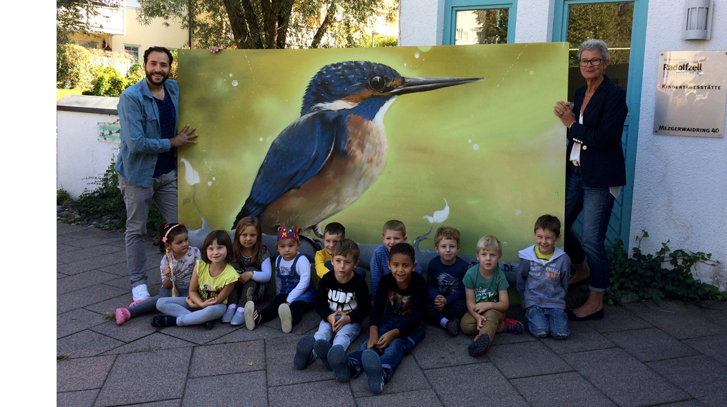 Seit 3 Jahren ist das Designstudio ein fester Bestandteil des Radolfzeller Altstadtfestes und hat auch diesmal wieder im Rahmen der Feierlichkeiten eine künstlerische Arbeit live vor Ort realisert. Das besondere an der Teilnahme: das Kunstwerk (Eisvogel) wurde auch diesmal wieder einer sozialen Einrichtungen Kindertagesstätte Mezgerwaidring gespendet. Somit erhält die Kita ein weiteres Kunstwerk von Eminent, die nun auf zwei Ebenen platziert werden. Denn zur Blaumeise vom Vorjahr hat nun der Eisvogel ein neues Zuhause gefunden. Mehr Infos unter Radolfzell Tourismus.