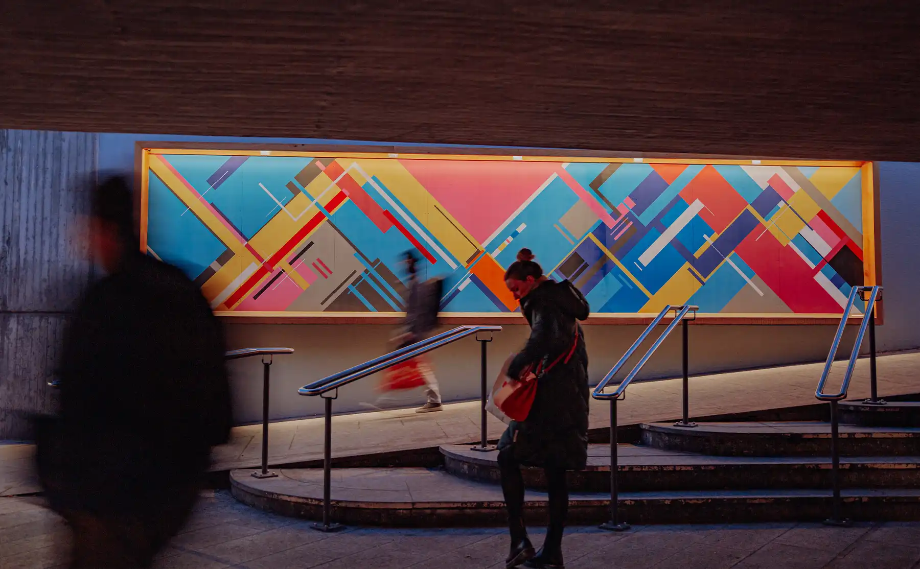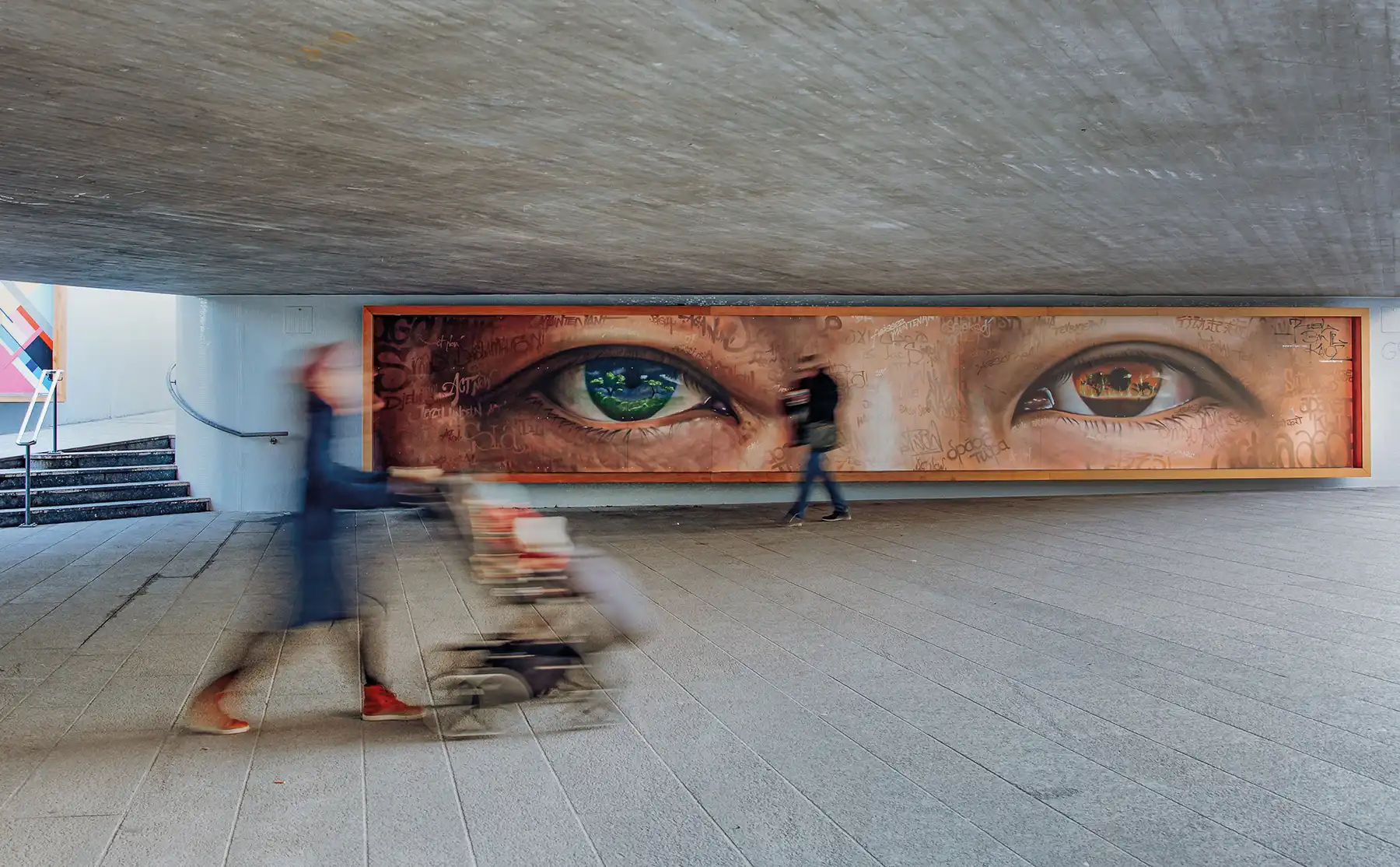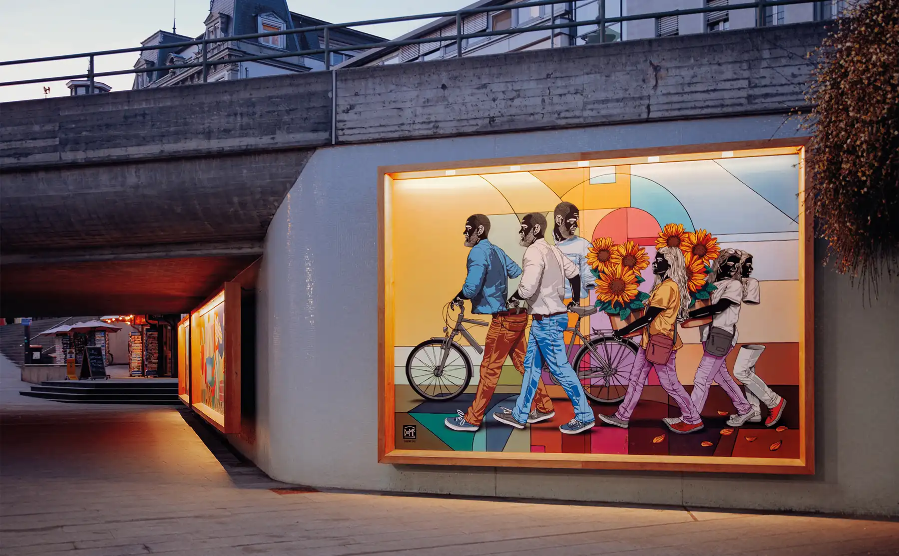In der zweiten Hälfte der OOH-Kampagne wird die typografische Gestaltung der Plakate um eine neue, farbenfrohe Bildwelt erweitert. Dabei brechen wir mit dem rein typografischen Ansatz, sodass die lebendigen Kunstwerke vom Mai-Event im Hintergrund als Eye-Catcher für die Plakatserie des Events im September dienen. Dies sorgt im Stadtgebiet für einen wiederkehrenden Wow-Effekt.